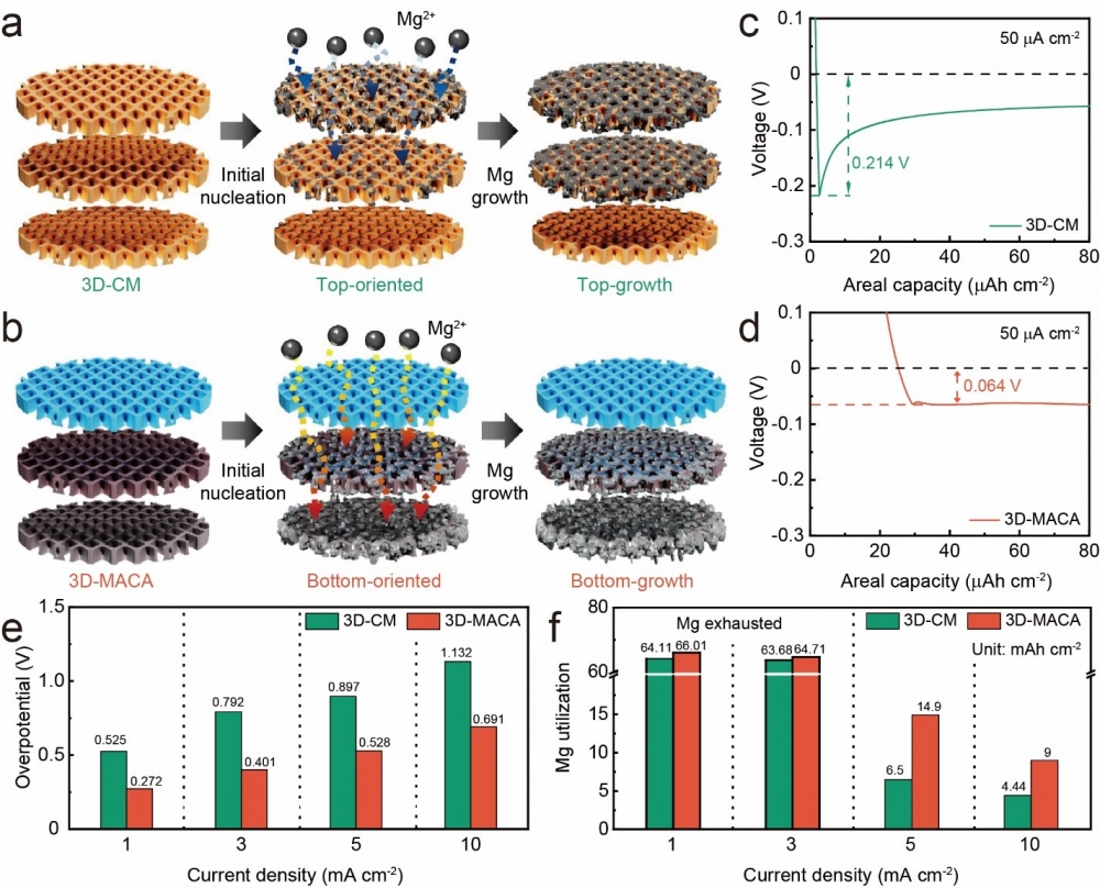 Magnesium-metal batteries (MMBs) are promising candidates for large-scale energy-storage systems owing to their high volumetric capacity, low cost, and high level of safety. However, the problems of dendritic Mg deposition and its poor adhesion to a substrate remain unresolved. Herein, we first propose a unique geometrical design of a top-to-bottom magnesiophilicity-gradient 3D host for reversible MMBs. By systematically stacking three mesh layers with different Mg affinities, the 3D-Mg affinity controlled architecture (3D-MACA) can be simply fabricated. The bottom layer was designed to contain numerous nanofibers decorated with magnesiophilic Au seeds, which effectively guided the bottom-oriented Mg nucleation. In addition, the electrically insulated top layer could minimize the undesirable top-plating of Mg. As a result, 3D-MACA showed the lowest nucleation overpotential and highest cycle retention among the potential candidates. For evidence of bottom-oriented growth, ex-situ observation analysis of 3D-MACA was performed, and the geometrical effect was further investigated and explained by the theoretical 3D simulation. The proposed strategy may provide insight for future studies aimed at solving the prevailing issues for MMBs; in addition, the unique design can be extended to other metal battery systems.