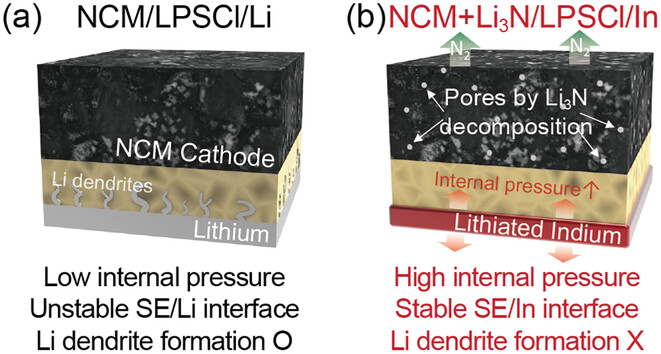 All-solid-state batteries (ASSBs) comprising solidified cathodes, electrolytes, and Li–metal anodes have attracted notable attention as promising future batteries for electric vehicles owing to their exceptional stability and expectation of achieving high energy density. However, its permanent operation has been hindered by Li dendrite growth, chemo–mechanical degradation, and interfacial instability, leading to Li exhaustion, increased resistance, and internal short-circuiting. Herein, for the first time, the authors report the effects of a lithium nitride (Li3N) sacrificial cathode on the cycling performance of ASSBs combined with a Li-free In layer. Through in situ evolved gas and internal pressure change analyses of the cells, it is found that, as with the liquid electrolyte cell, the decomposed Li3N compensates for active Li consumed by side reactions in the cell. Moreover, it is demonstrated that the improved interparticle contact by volume expansion of In through additionally supplied Li as well as the interfacial stability at the anode side by the dendrite-free In layer, are strongly responsible for the improved cyclability of the ASSBs. The findings reveal the effectiveness of the Li compensation approach for the stable cycling of ASSBs based on the secured interfacial stability at the anode side.