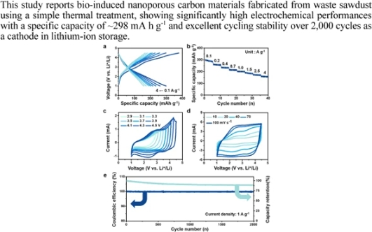 Sustainable resources, particularly those induced from bio-derived waste materials, can be transformed into useful nanocarbon materials with high functionality. In this study, nanoporous carbon materials (N-CMs) were fabricated from waste sawdust using a simple heating process and a carefully controlled activation process. The waste-induced N-CMs had a high specific surface area of ∼3044.6 m2 g−1, a nanoporous structure, and > 6 at.% heteroatoms. These properties led to high electrochemical performance with a specific capacity of ∼298 mAh g−1 and excellent cycling stability over 2,000 cycles as a cathode in lithium-ion storage. Moreover, when the N-CMs were assembled with a nanostructured carbon-based anode, all full carbon-based cells could deliver high specific energy and specific power of ∼377 Wh kg−1 and ∼20,247 W kg−1, respectively, with a long-term cycle life of more than 1,000 cycles.