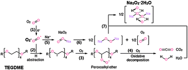 Recently, metal–air batteries, such as lithium–air and zinc–air systems, have been studied extensively as potential candidates for ultra-high energy density storage devices because of their exceptionally high capacities. Here, we report such an electrochemical system based on sodium, which is abundant and inexpensive. Two types of sodium–oxygen batteries were introduced and studied, i.e. with carbonate and non-carbonate electrolytes. Both types could deliver specific capacities (2800 and 6000 mA h g−1) comparable to that of lithium–oxygen batteries but with slightly lower discharge voltages (2.3 V and 2.0 V). The reaction mechanisms of sodium–oxygen batteries in carbonate and non-carbonate electrolytes were investigated and compared with those of lithium–oxygen batteries.