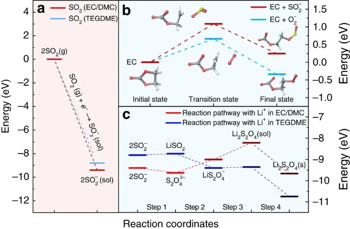 Shedding new light on conventional batteries sometimes inspires a chemistry adoptable for rechargeable batteries. Recently, the primary lithium-sulfur dioxide battery, which offers a high energy density and long shelf-life, is successfully renewed as a promising rechargeable system exhibiting small polarization and good reversibility. Here, we demonstrate for the first time that reversible operation of the lithium-sulfur dioxide battery is also possible by exploiting conventional carbonate-based electrolytes. Theoretical and experimental studies reveal that the sulfur dioxide electrochemistry is highly stable in carbonate-based electrolytes, enabling the reversible formation of lithium dithionite. The use of the carbonate-based electrolyte leads to a remarkable enhancement of power and reversibility; furthermore, the optimized lithium-sulfur dioxide battery with catalysts achieves outstanding cycle stability for over 450 cycles with 0.2 V polarization. This study highlights the potential promise of lithium-sulfur dioxide chemistry along with the viability of conventional carbonate-based electrolytes in metal-gas rechargeable systems.