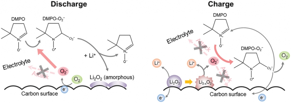 Low round-trip efficiency and poor cycle stability remain the major challenges associated with lithium–oxygen (Li–O2) batteries. These issues are primarily triggered by or correlated to the radical species produced during the operation of Li–O2 cells, which lead to significant deterioration of the electrolytes and air electrodes. Regulation of the reactivity of these radical species would thus open up opportunities to suppress such side reactions. Herein, a dual-functioning molecule that is capable of mitigating the reactivity of radical species produced in a Li–O2 cell by reversibly forming stable intermediate complex during both the discharge and charge processes is introduced. Specifically, 5,5-dimethyl-1-pyrroline N-oxide (DMPO) is exploited, which has been widely used as a chemical agent to detect oxygen radicals, to induce the reversible formation of an intermediate complex, DMPO–O2−, in the presence of superoxide radicals. It is demonstrated that DMPO mediates the O2−-involved electrochemical reaction, leading to significant suppression of side reactions and a remarkably improved oxygen efficiency. Unexpectedly, it is also observed that upon charging, DMPO actively scavenges the superoxides from the surface of discharge products, thus substantially lowering the charging overpotential. The combined radical mediation and scavenging of superoxides result in cycle stability of a practical Li–O2 cell over 200 cycles with a specific capacity of 1000 mAh g−1. The findings indicate the importance of controlling the reactivity of radical species and suggest a new pathway toward the realization of stable and efficient Li–O2 batteries.