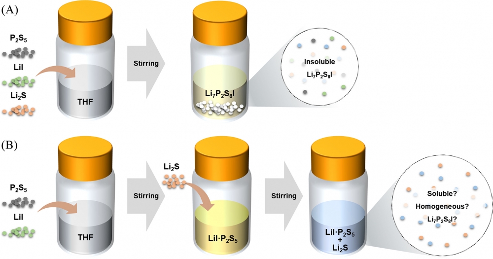 Liquid-phase synthesis for a sulfide-based solid electrolyte has been widely studied due to its great advantage of being a simpler and more cost-effective method compared with the conventional solid-phase synthesis, even it could induce homogeneous reactions in the solution. However, the physically and chemically stable phosphorus pentasulfide (P2S5) is barely soluble in various solvents; this has been a major problem for achieving a pure solution-phase dissolving solid electrolyte. Therefore, exploring an effective additive for liquid-phase synthesis would be worthwhile and could potentially lead to the discovery of new chemicals to produce qualified solid electrolytes. In this paper, lithium iodide's (LiI) dual role as a strong nucleophile as well as a major reactant source for producing Li7P2S8I is first investigated. The nucleophilic additive of LiI has been proven to break the P-S bonds of P2S5, driving the insoluble P2S5 to become the soluble intermediate complex. Also, it is demonstrated that controlling the reaction times between the LiI and the P2S5 is key to achieving solution-based synthesis, and the role of LiI is investigated by conducting bonding analysis.