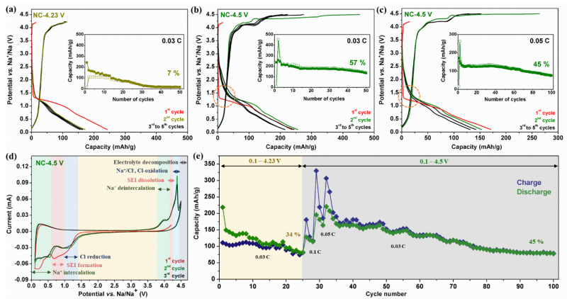 Sodium-rich metallic NaxCl has received significant attention as a low-cost alternative to the conventional electrode materials used in Li-ion batteries. However, the poor cyclability of NaxCl remains a major challenge to its practical application. Here, we developed a simple method for improving the electrochemical performance of NaxCl by controlling the upper limit of cut-off voltage. We demonstrated that additional Na-vacancy defects can be introduced in the NaCl structure during the high-voltage activation process at 4.5 V. The structure then accommodated more sodium ions during the next discharge, resulting in increased capacity. At the same time, Cl-ions released by NaCl decomposition were oxidized to form Cl-based organic species at the active material interfaces. This played a crucial role in protecting the NaCl electrode from undesired side reactions at high voltage. In short, this control of the charging protocol helped to induce more vacancies in the NaCl structure, as well as form stable interphases on the electrode surface, contributing to the increased capacity and enhanced cycle stability. This study will help in exploring a new approach for developing low-cost and high-capacity electrode material, which can potentially be applied in future energy-storage systems.