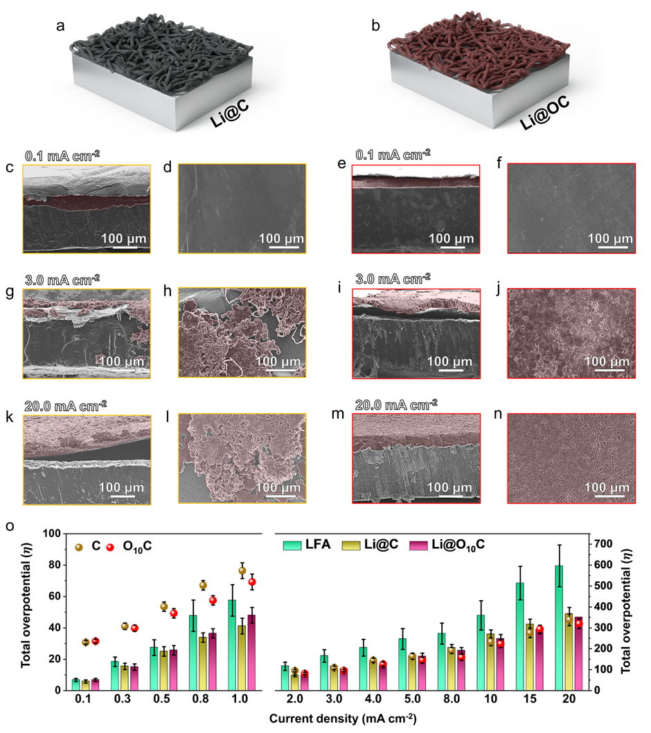 The lithium deposited via the complex electrochemical heterogeneous lithium deposition reaction (LDR) process on a lithium foil-based anode (LFA) forms a high-aspect-ratio shape whenever the reaction kinetics reach its limit, threatening battery safety. Thereby, a research strategy that boosts the LDR kinetics is needed to construct a high-power and safe lithium metal anode. In this study, the kinetic limitations of the LDR process on LFA are elucidated through operando and ex situ observations using in-depth electrochemical analyses. In addition, ultra-thin (≈0.5 µm) and high modulus (≥19 GPa) double-walled carbon nanotube (DWNT) membranes with different surface properties are designed to catalyze high-safety LDRs. The oxygen-functionalized DWNT membranes introduced on the LFA top surface simultaneously induce multitudinous lithium nuclei, leading to film-like lithium deposition even at a high current density of 20 mA cm−2. More importantly, the layer-by-layer assembly of the oxygen-functionalized and pristine DWNT membranes results in different surface energies between the top and bottom surfaces, enabling selective surface LDRs underneath the high-modulus bilayer membranes. The protective LDR on the bilayer-covered LFA guarantees an invulnerable cycling process in large-area pouch cells at high current densities for more than 1000 cycles, demonstrating the practicability of LFA in a conventional liquid electrolyte system.