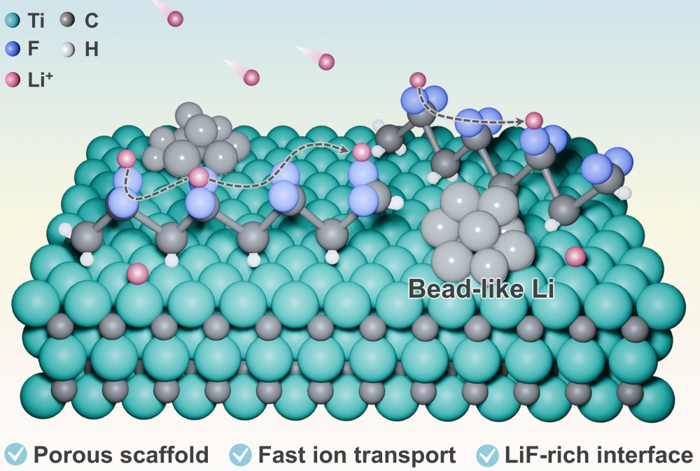 Li-metal batteries show remarkable potential for achieving high energy densities; however, their practical application is hindered by Li dendrite growth and significant volume changes during cycling. The present study was aimed at resolving these issues by creating a novel functionalized MXene scaffold (β-PM) for anode-less Li metal batteries, designed to suppress dendrite formation and improve the cycling stability. The β-PM scaffold integrates fluorine-aligned polyvinylidene fluoride on its surfaces, which expands the interlayer spacing and provides abundant F-rich sites. This unique architecture promotes efficient Li-ion diffusion, resulting in unusual bead-shaped Li deposits while effectively preventing dendrite formation and providing favorable accommodation sites for Li storage. Consequently, the β-PM scaffold contributes to significantly improved the cycling stability and electrochemical performance, establishing it as a promising platform for advanced, dendrite-free energy storage applications.