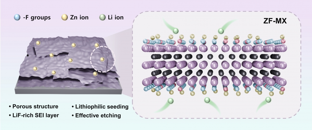 In this study, we introduce a strategically engineered MXene design, ZF-MX, optimized for application as a host in anode-free lithium metal batteries (AFLMBs). Leveraging ZnF2 as an etchant, ZF-MX features a fluorine-rich surface, integrated Zn²⁺ ions, and increased interlayer spacing. The incorporation of Zn²⁺ ions on the MXene surface enhances Li+ ion diffusion kinetics while suppressing dendrite formation, ensuring dense Li deposition. Furthermore, the fluorine-rich surface contributes to stable interfacial chemistry, enabling long-term cycling with minimal side reactions. As a result, ZF-MX exhibited exceptional cycling stability, sustaining over 700 h of operation, coupled with high Coulombic efficiency and significantly reduced nucleation overpotential. These results demonstrate an innovative approach for tailoring MXene materials for dendrite-free Li cycling, offering opportunities for high-energy density AFLMBs