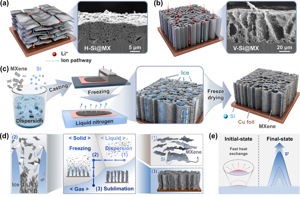 Despite its exceptionally high theoretical capacity, which far exceeds that of conventional graphite, the silicon anode suffers from severe volumetric expansion and intrinsically low electrical conductivity, factors that critically hinder its practical application in high-energy Li ion batteries. To overcome these limitations, a vertically aligned Si@MXene (V-Si@MX) composite electrode was fabricated via directional freezing followed by freeze-drying. This architecture offers unidirectional pathways for ion and electron transport, interconnected pores, and strong interfacial bonding between Si and the MXene host, thereby effectively mitigating volume changes while enhancing charge transport. Electrochemical testing revealed superior performance relative to conventional electrodes, including high-rate capability (delivering about 1,500 mAh g-1 at up to 3 C), long-term cycling stability, low charge-transfer resistance, and a high Li+ diffusion coefficient. These results demonstrate that vertical structural engineering represents a promising and scalable approach for developing high-performance Si-based anodes.