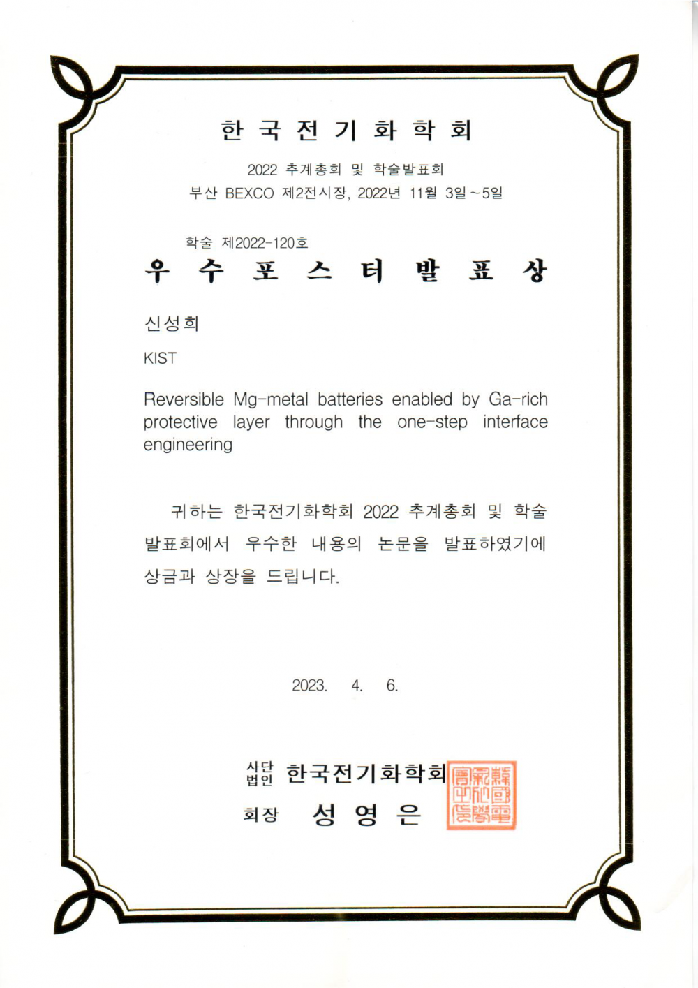 2022년 추계 한국전기화학회 신성희 학생 우수포스터상 수상