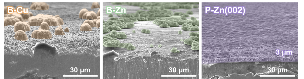 연구팀은 이러한 한계를 해결하기 위해 집전체의 면(결정 방향)을 한 방향으로 정렬하는 방식을 도입했다. 시중에서 구할 수 있는 아연 포일을 열처리해 (002) 면 중심으로 정렬하고 표면 거칠기와 결함을 줄이는 간단한 공정만으로도 효과를 얻을 수 있었다. 연구팀은 “자갈길을 매끈한 보도블록으로 바꿔주니 금속이 옆으로 미끄러지듯 자라는 원리”라고 설명했다.
